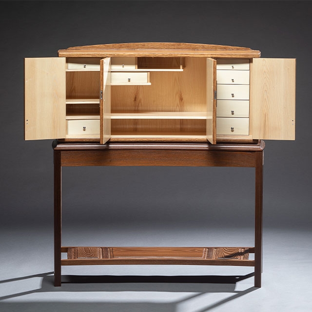 The sweeping curves and uninterrupted lines in John Cameron's work are a result of the relationship between design and material. Each piece of stock is carefully chosen and sometimes resawn, exposing its best face. Boards are often from the same tree, providing a unity of color and hue. Handles, pulls, and hinges are made in the shop, using complementary fine woods and precious metals which John sometimes engraves.